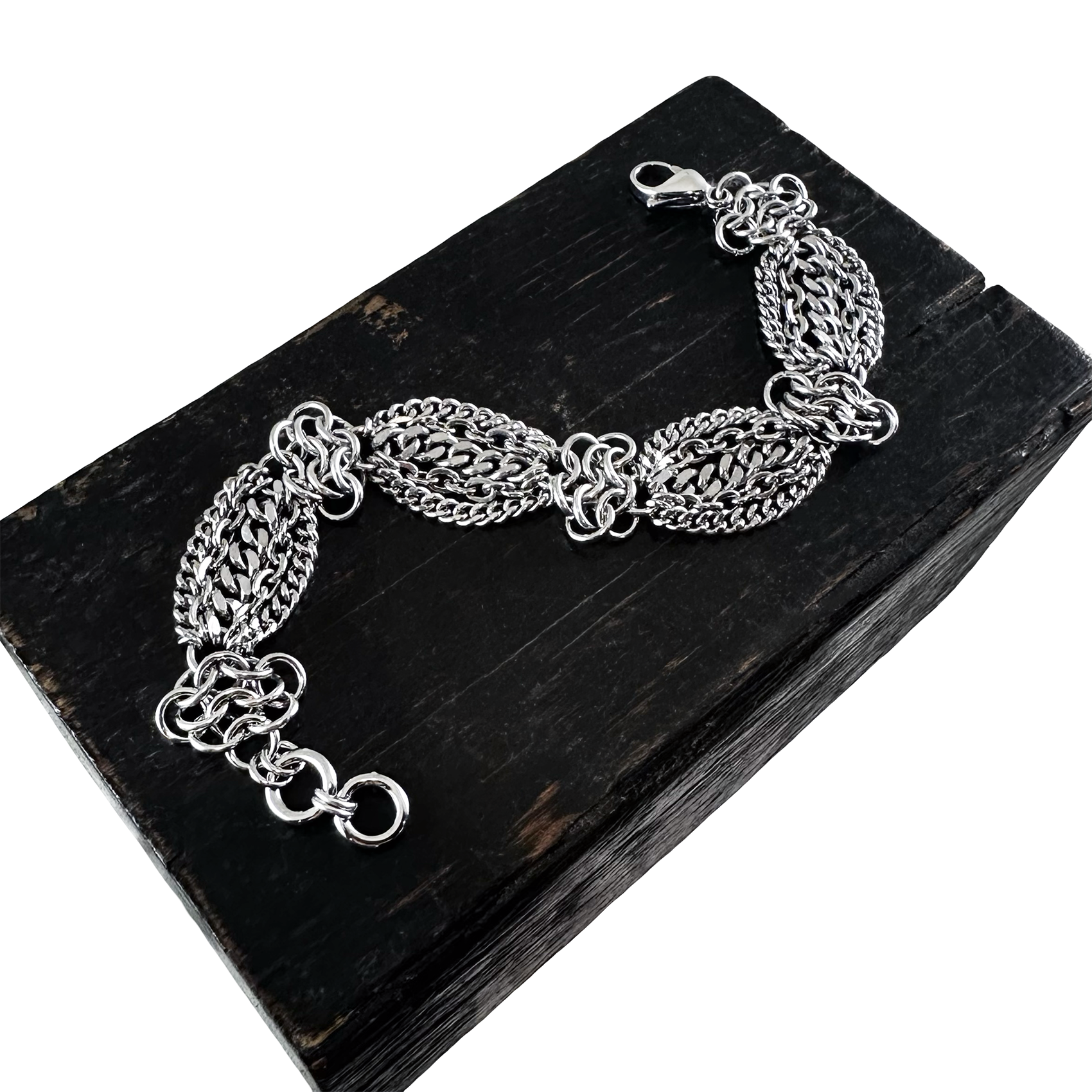 This detailed little bracelet has five hand-linked chainmaille rosettes with multi-chain sections in between, including two sizes of curb and a flattened cable. The facets of each chain reflect the light and give the bracelet some eye-catching sparkle. Delicate, but a little rock and roll at the same time.