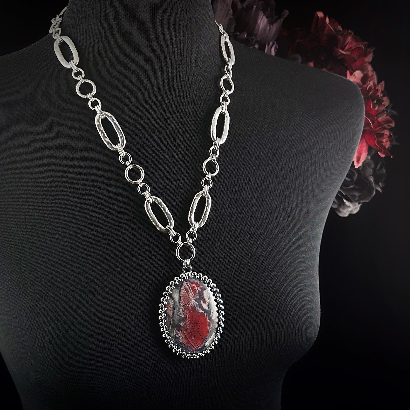 A wonderfully large, red and gray African jasper is set with tiny stainless steel spheres and hangs from a chain of large textured oval links, medium rope-textured links, and smaller smooth links.