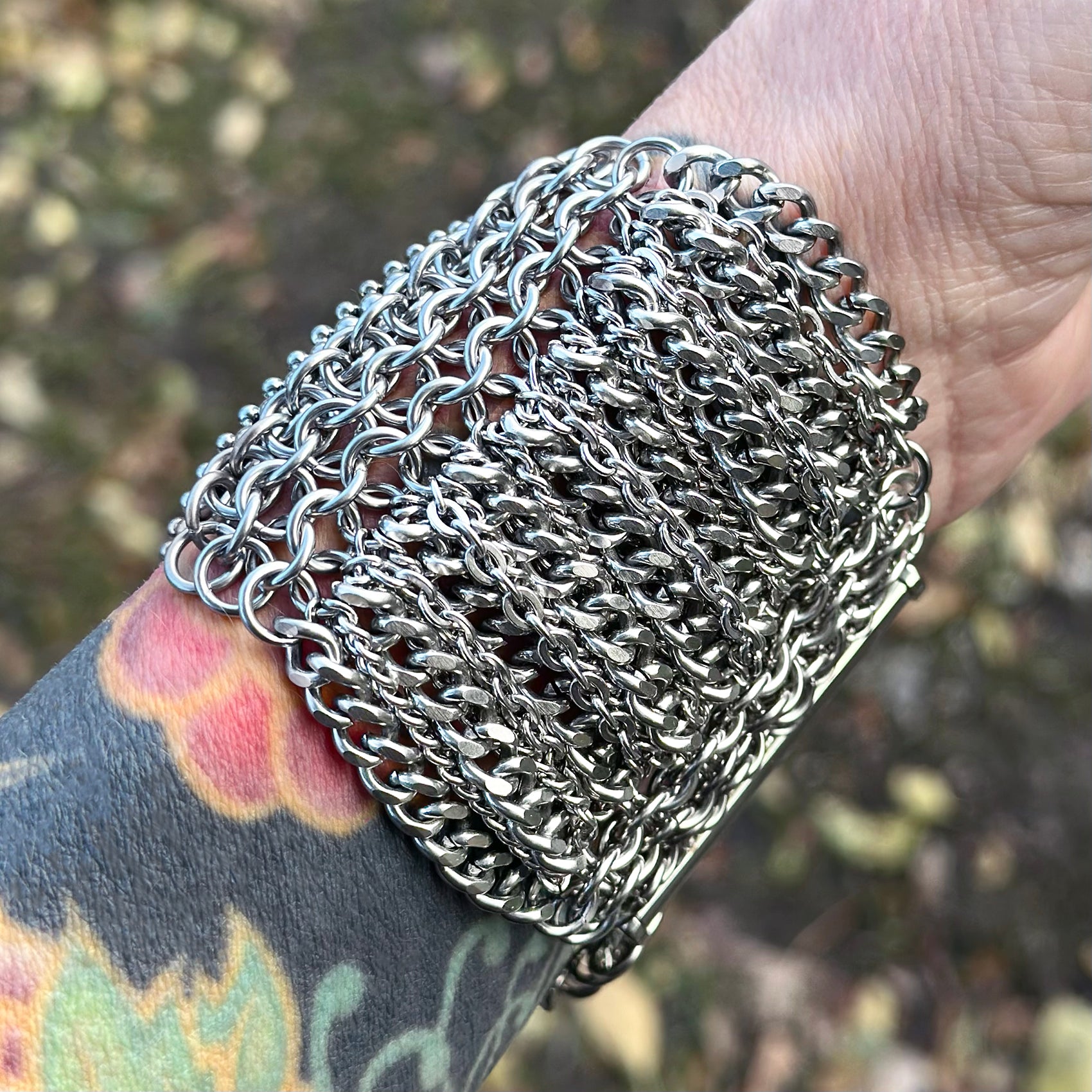 Rapt in Maille jewelry is made predominantly from stainless steel, a very durable, affordable, hypoallergenic, and easy-to-care-for material. Unless otherwise noted, everything that is silver in color is stainless steel, including all jump rings, chains, findings, and clasps.