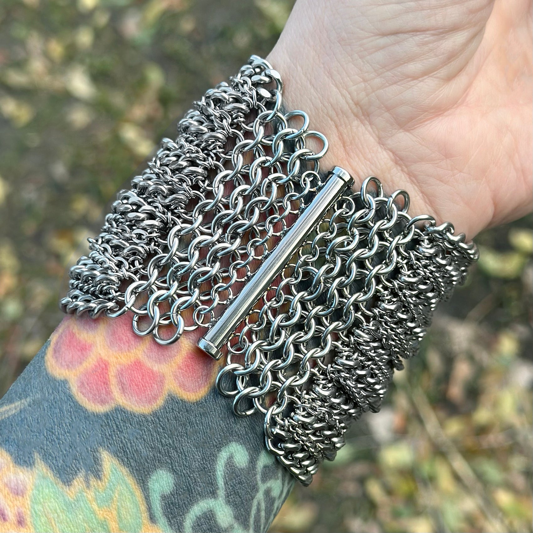 The stone is set with tiny stainless spheres, then links are welded to the sides so chainmaille can be attached. It has sections of mixed chain on the sides and ends with additional chainmaille sections. Large tube/slide clasp.