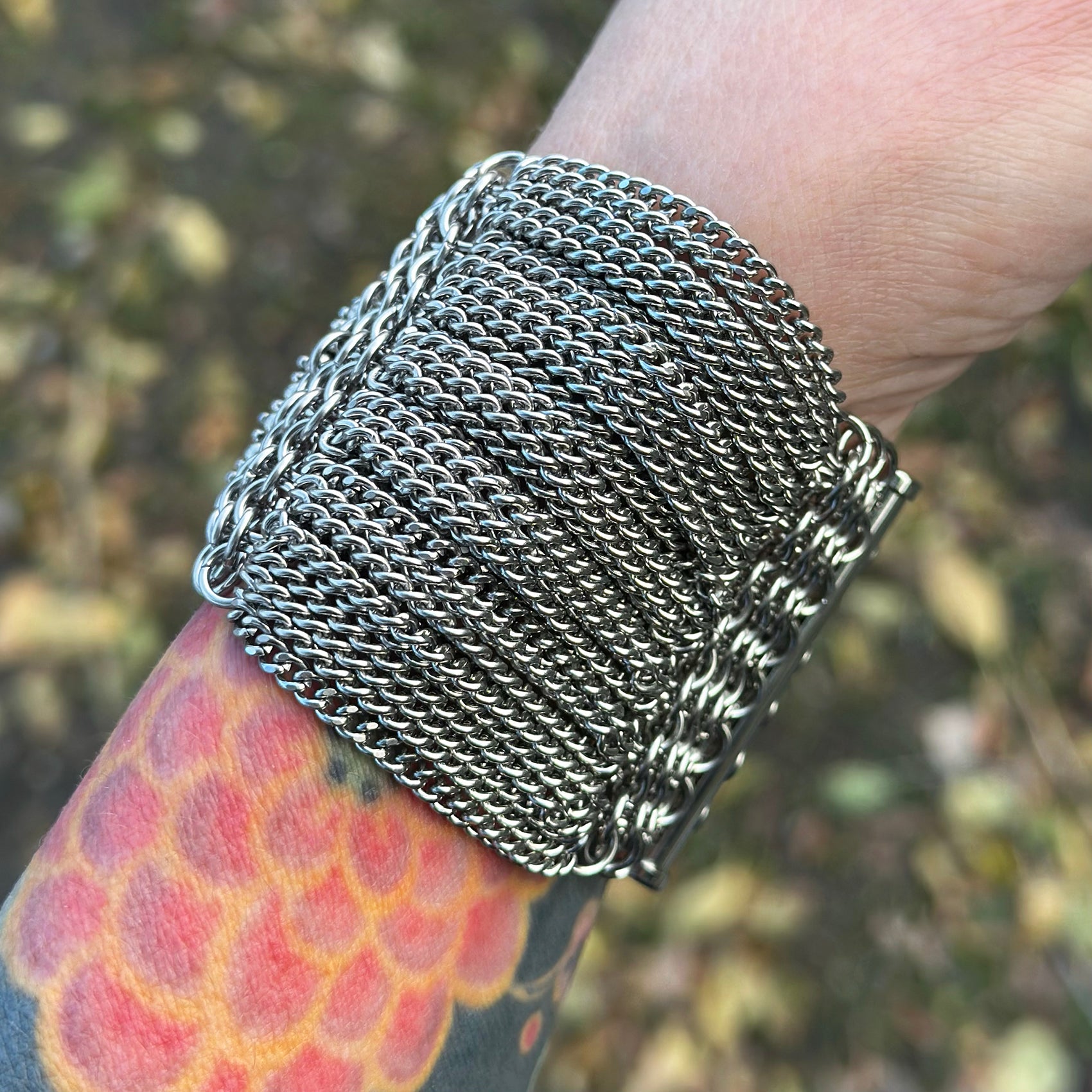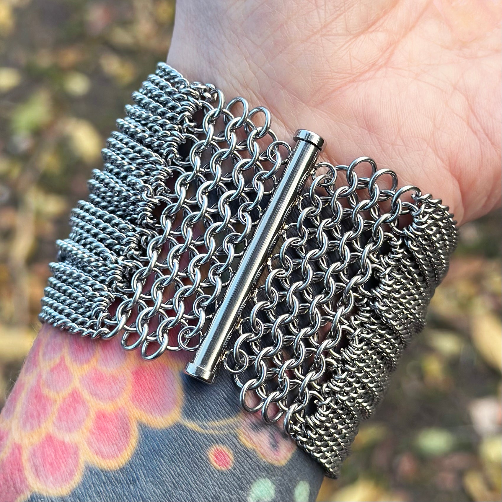 The stone is set with tiny stainless spheres, then links are welded to the sides so chainmaille can be attached. It has sections of slinky curb chain on the sides and ends with additional chainmaille sections. Large tube/slide clasp.