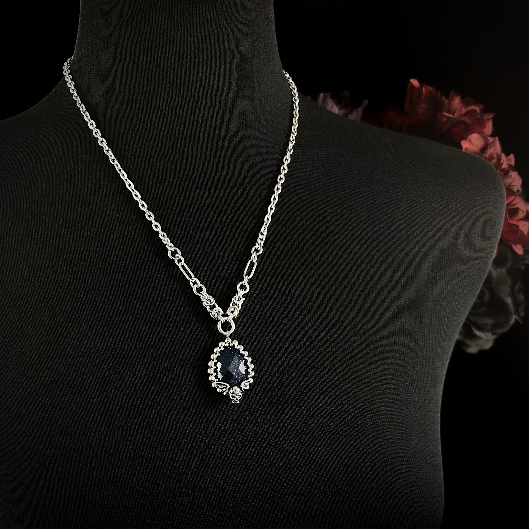 A small, rose-cut, dark midnight blue goldstone is set with tiny stainless steel spheres and has a winged skull perched at the bottom. The glitter-like particles in the stone, along with the surface facets, makes this little gem very sparkly. It hangs on a delicate chain of mixed elements, including hand-linked Byzantine chainmaille, round and oval links, curb and flattened cable chain.