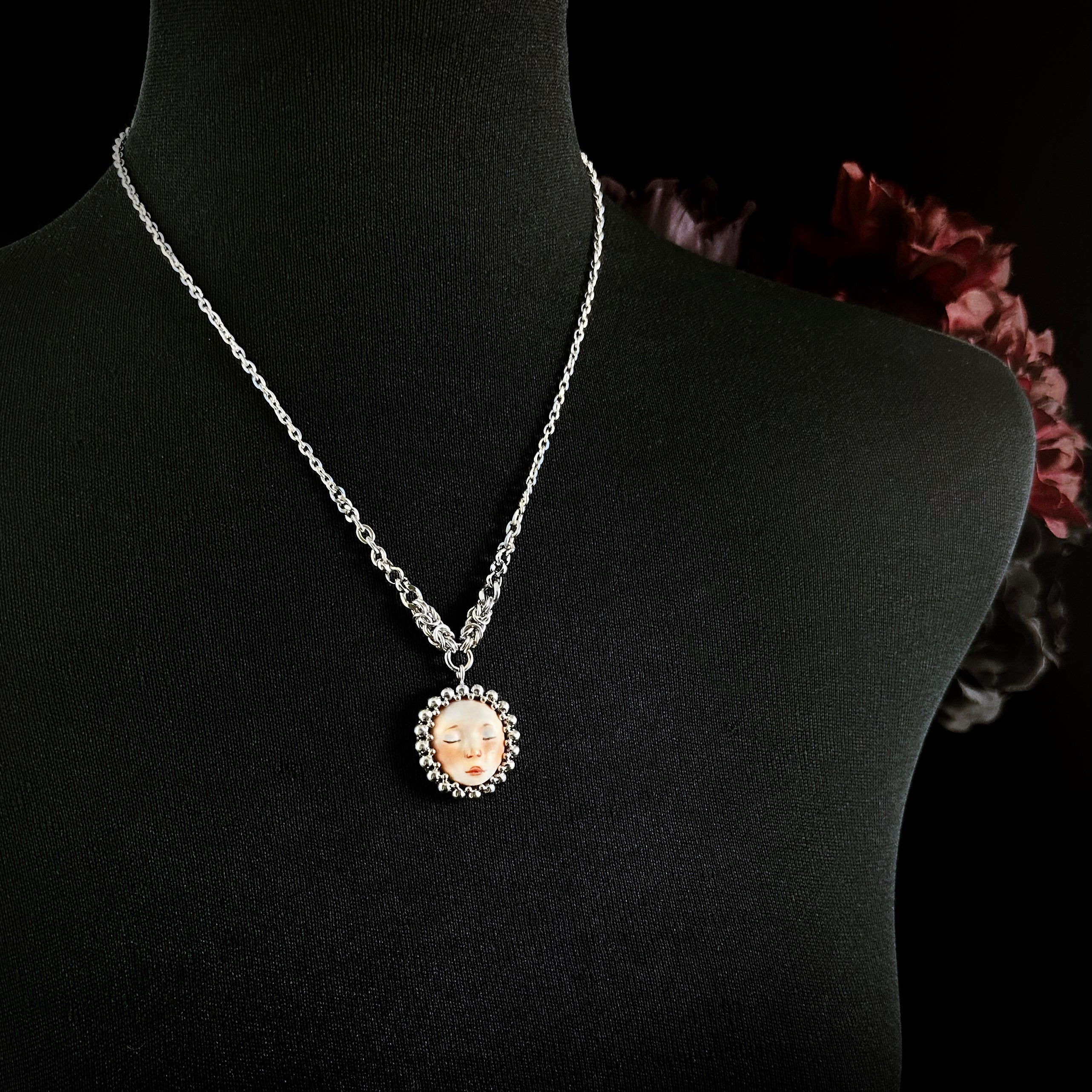 A small, hand-painted porcelain face at rest is set with tiny stainless steel spheres and hangs on a delicate chain of mixed elements, including hand-linked Byzantine chainmaille, rolo and cable chain.