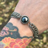 A small, round, hematite cabochon is set with very tiny stainless spheres and has a "ribbon" of curb chain coming off each side. The ends of the bracelet have a section of chunky curb chain to weight the clasp at the bottom of the wrist, which helps keep the stone on the top.