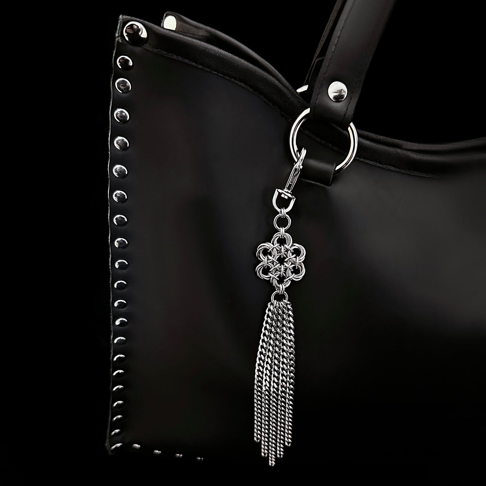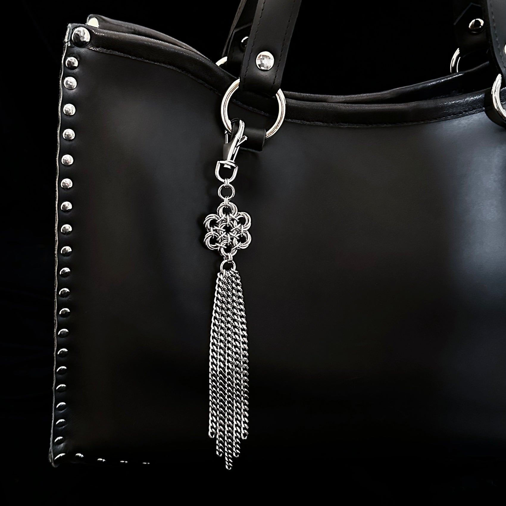 Decorate your favorite handbag with this handmade tassel charm featuring an eye-catching NEST flower accent perched atop several strands of flowing curb chain. Mix and match with other charms to build your signature style, or wear it alone as a single standout piece. Perfect for adding personality to your purse or keys.