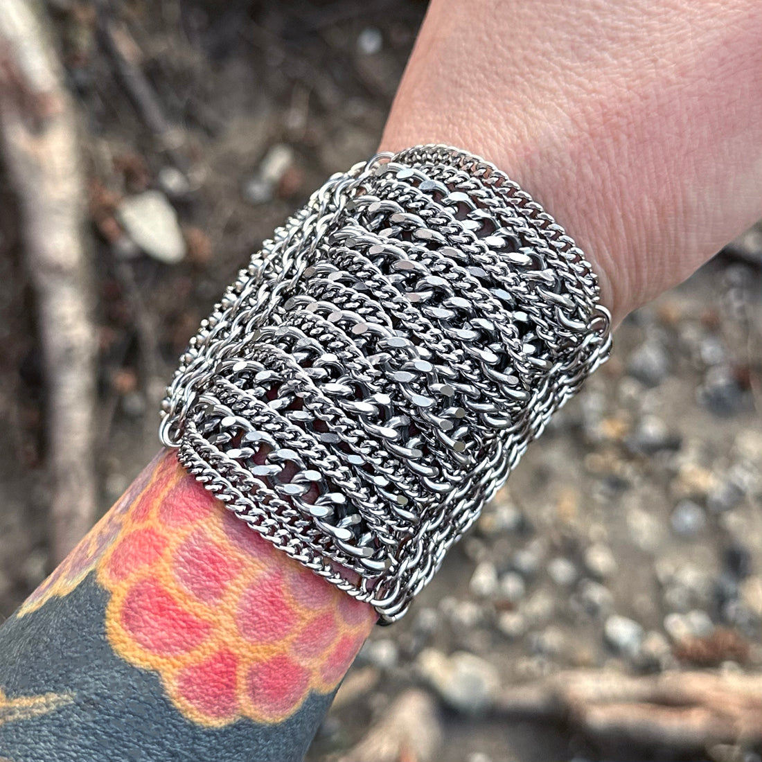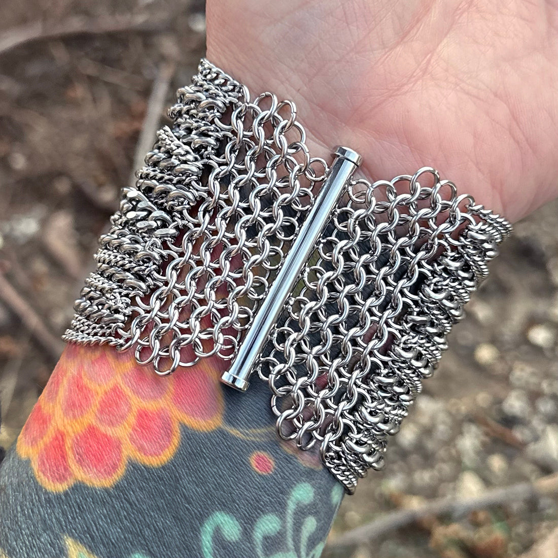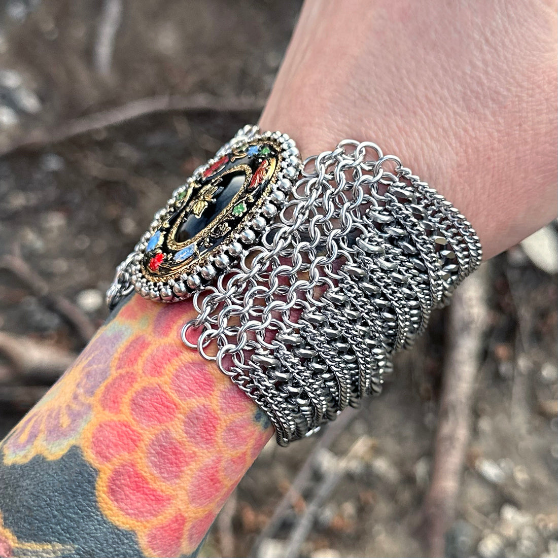 This lovely, ornate vintage glass oval has a black background with gold framing and scrolling details, with other colored objects depicting flowers, birds and fish. It is set with tiny stainless spheres, then links are welded to the sides so chainmaille can be attached. This cuff also has wide chain sections comprised of alternating sizes of curb chain. The cuff ends with additional chainmaille sections. Large tube/slide clasp.