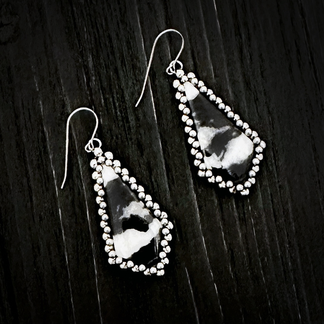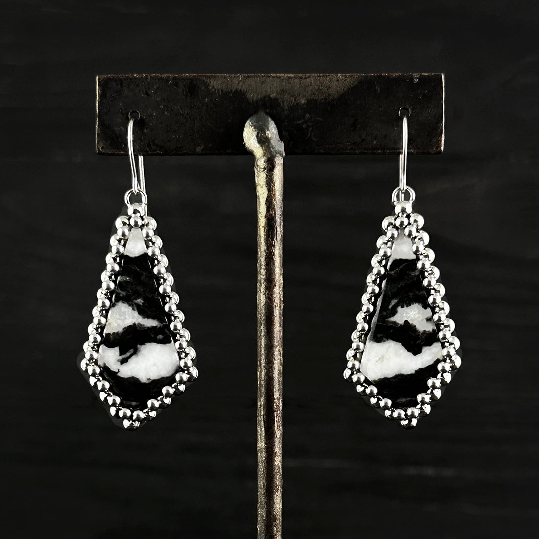 These bold, black and white zebra jasper earrings are shaped like upside-down kites, or angled teardrops. They are set with tiny stainless spheres and hang from a simple ear wire.