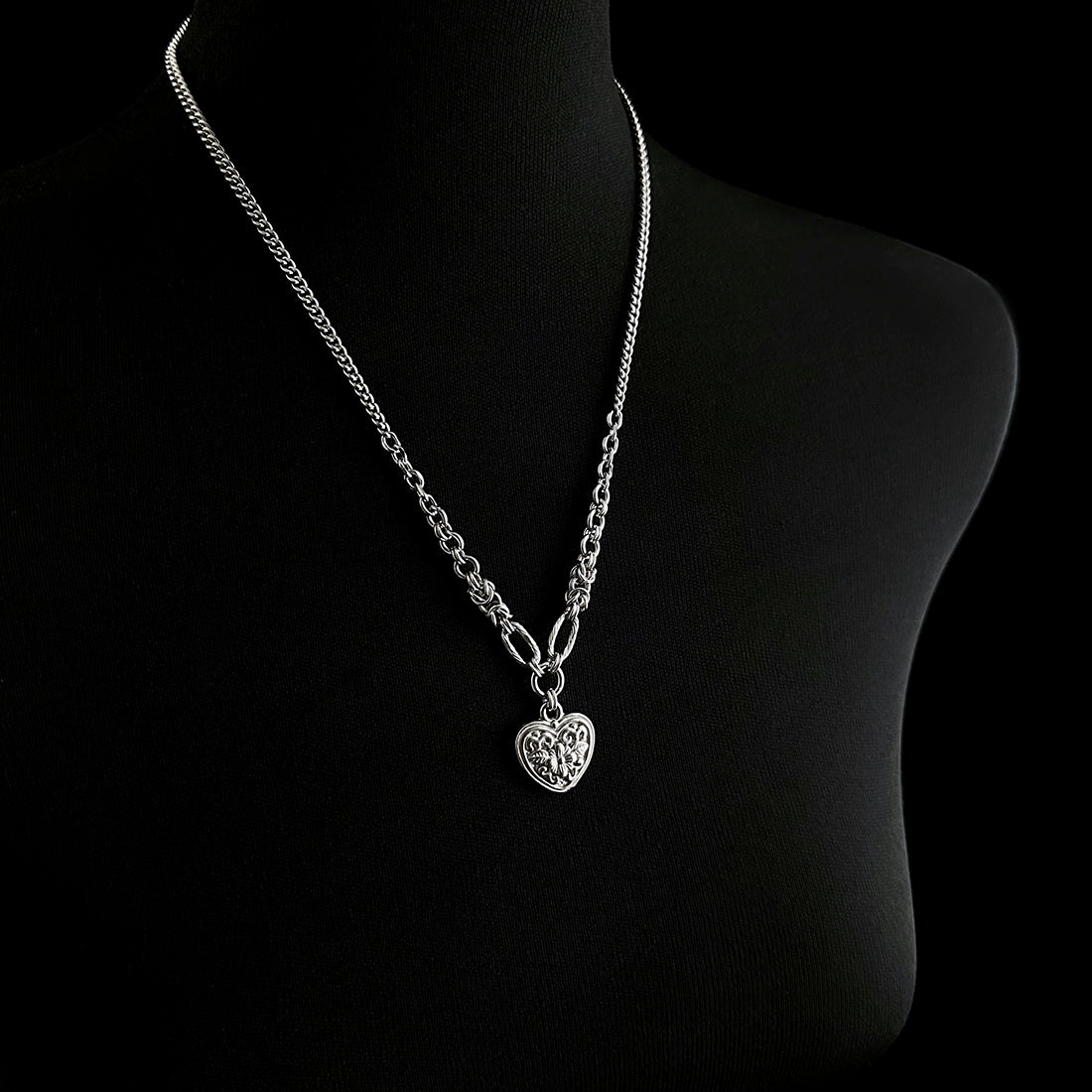 A single forget-me-not sits in the center of this softly-shaped heart, with leaves and ornamental scrollwork surrounding it. The accompanying chain is a thoughtful mix of elements— including rope-textured oval links and Byzantine chainmaille sections. Perfect for expressing love and affection as a special gift, or keeping cherished memories of a loved one close to your heart.