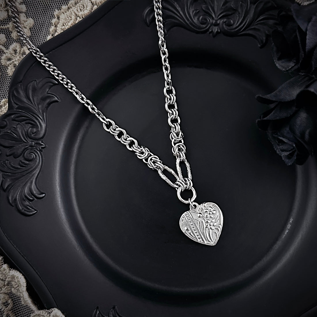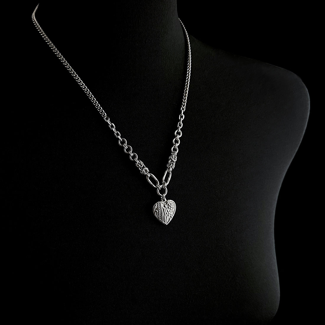 This intricately detailed heart features two forget-me-nots with flowing foliage, a vertical ribbon and delicate scrollwork. The accompanying chain is a thoughtful mix of elements— including rope-textured oval links and Byzantine chainmaille sections. Perfect for expressing love and affection as a special gift, or keeping cherished memories of a loved one close to your heart.