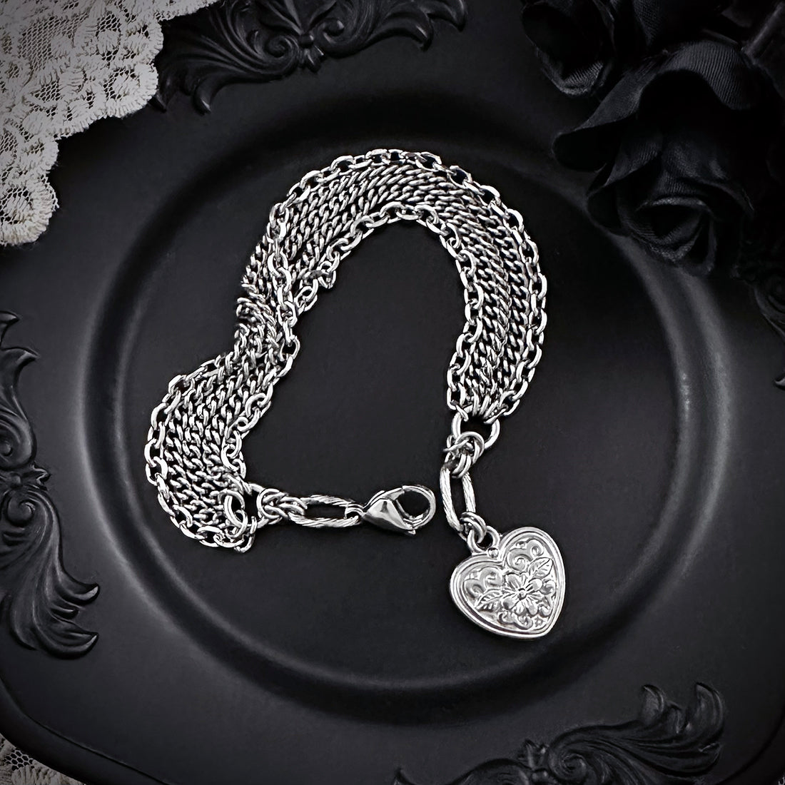 A single heart charm hangs from a multi-strand bracelet of slinky curb and faceted cable chain. Details at the ends of the bracelet include a small segment of Byzantine chainmaille and rope-textured oval links. The softly-shaped heart charm is adorned with a single forget-me-not, with leaves and ornamental scrollwork surrounding it.
