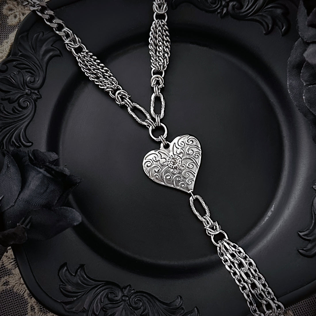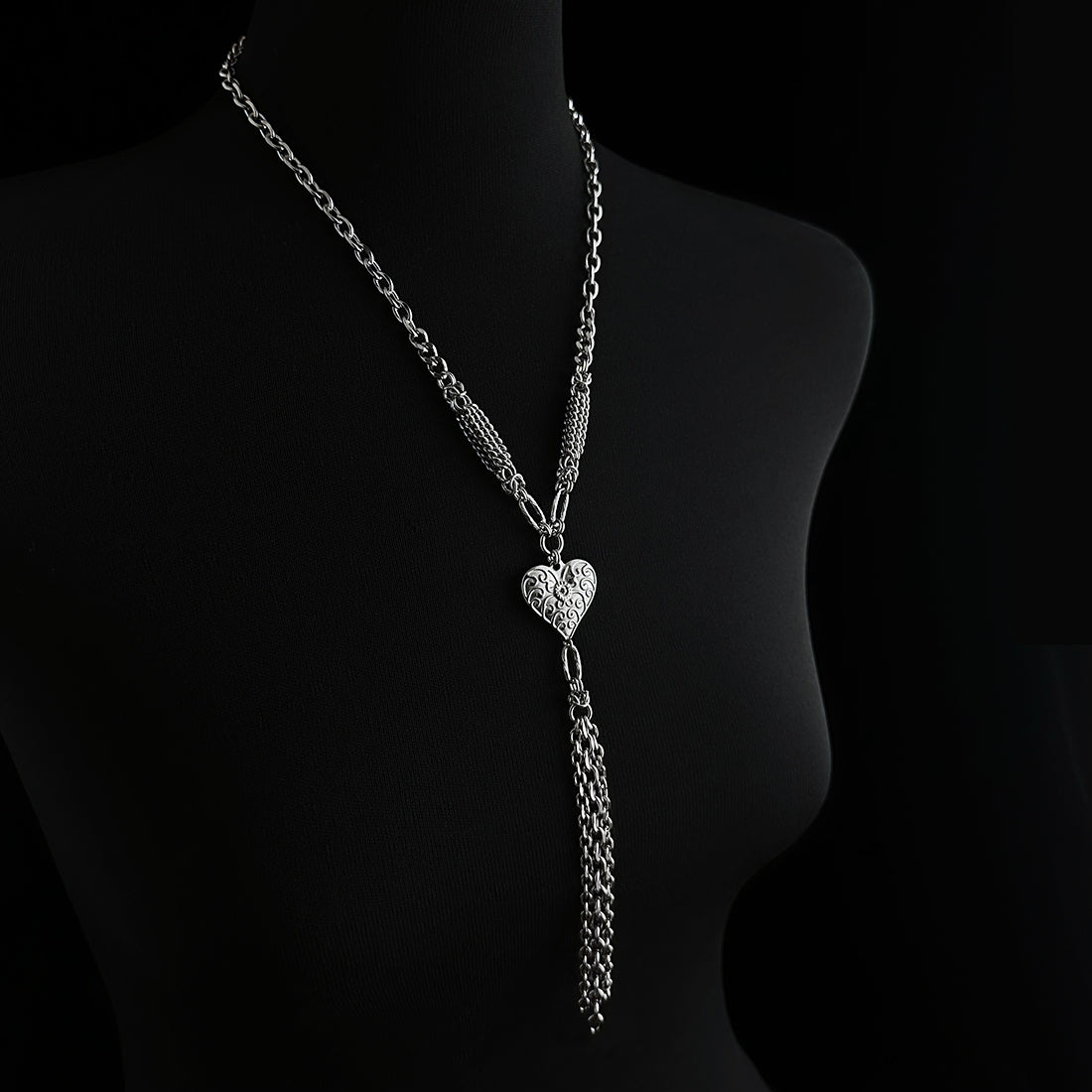 This charming necklace has a large heart with delicately embossed scrollwork and a triple-strand tassel of faceted cable chain. The neckchain has varied chains and textures, featuring contrasting multi-strand segments of slinky curb chain.
