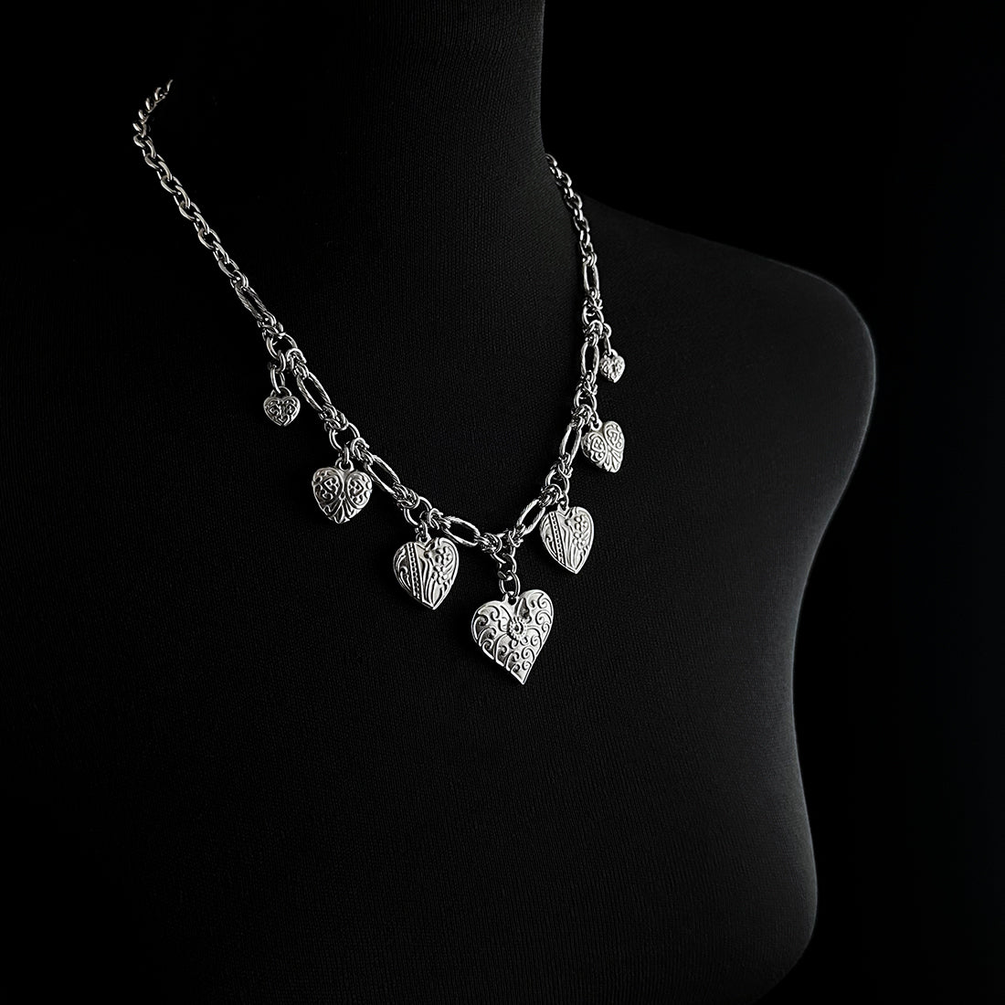 This bold, multi-charm necklace has a gorgeous mix of four detailed hearts, combining embossed forget-me-not flowers and various scrollwork. The intricate chain connects smooth round links and rope-textured oval links with small segments of Byzantine chainmaille. The necklace ends with a longer length of sparkly faceted cable chain. A Victorian-inspired piece that expresses multiple sentiments--remembrance, devoted and ever-growing love, and eternal connection.
