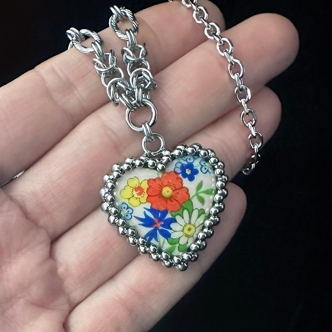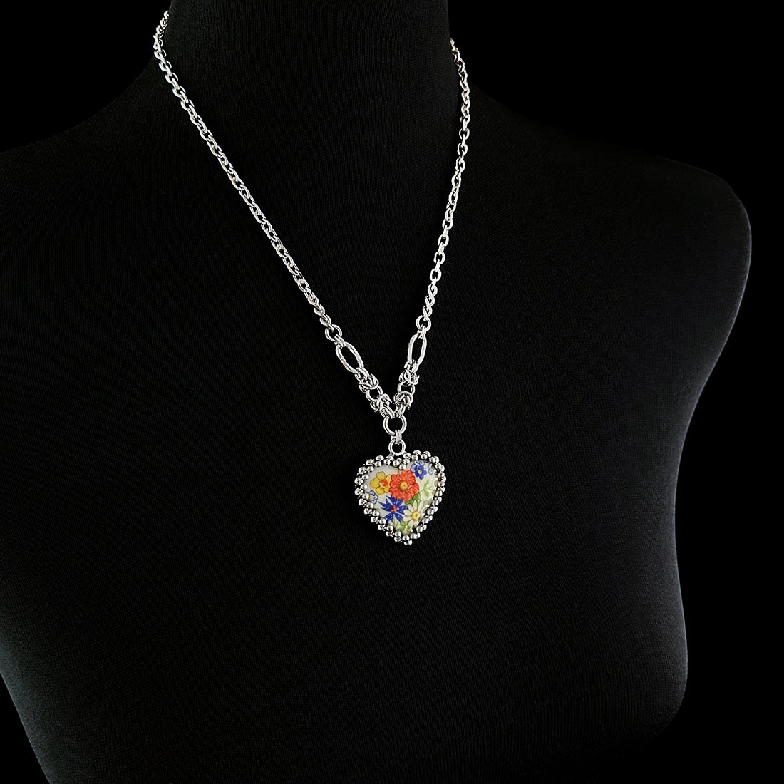 This vintage glass heart from 1950's Germany features various red, blue, yellow and white flowers with green leaves. It is set with tiny stainless spheres and hangs from a chain of mixed chains, links and patterns. These hearts were found wrapped in their original box and are in like-new condition.