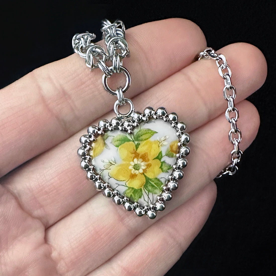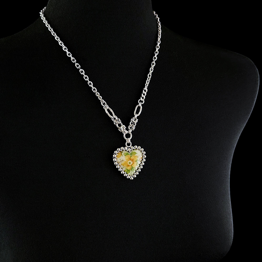 This vintage glass heart from 1950's Germany features a golden yellow flower with surrounding leaves and buds. It is set with tiny stainless spheres and hangs from a chain of mixed chains, links and patterns. These hearts were found wrapped in their original box and are in like-new condition.