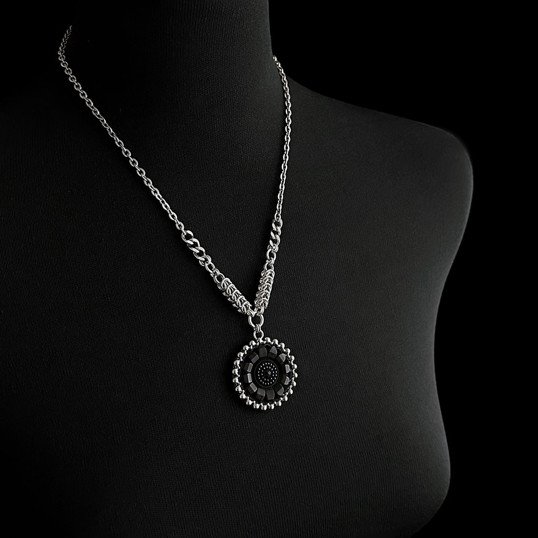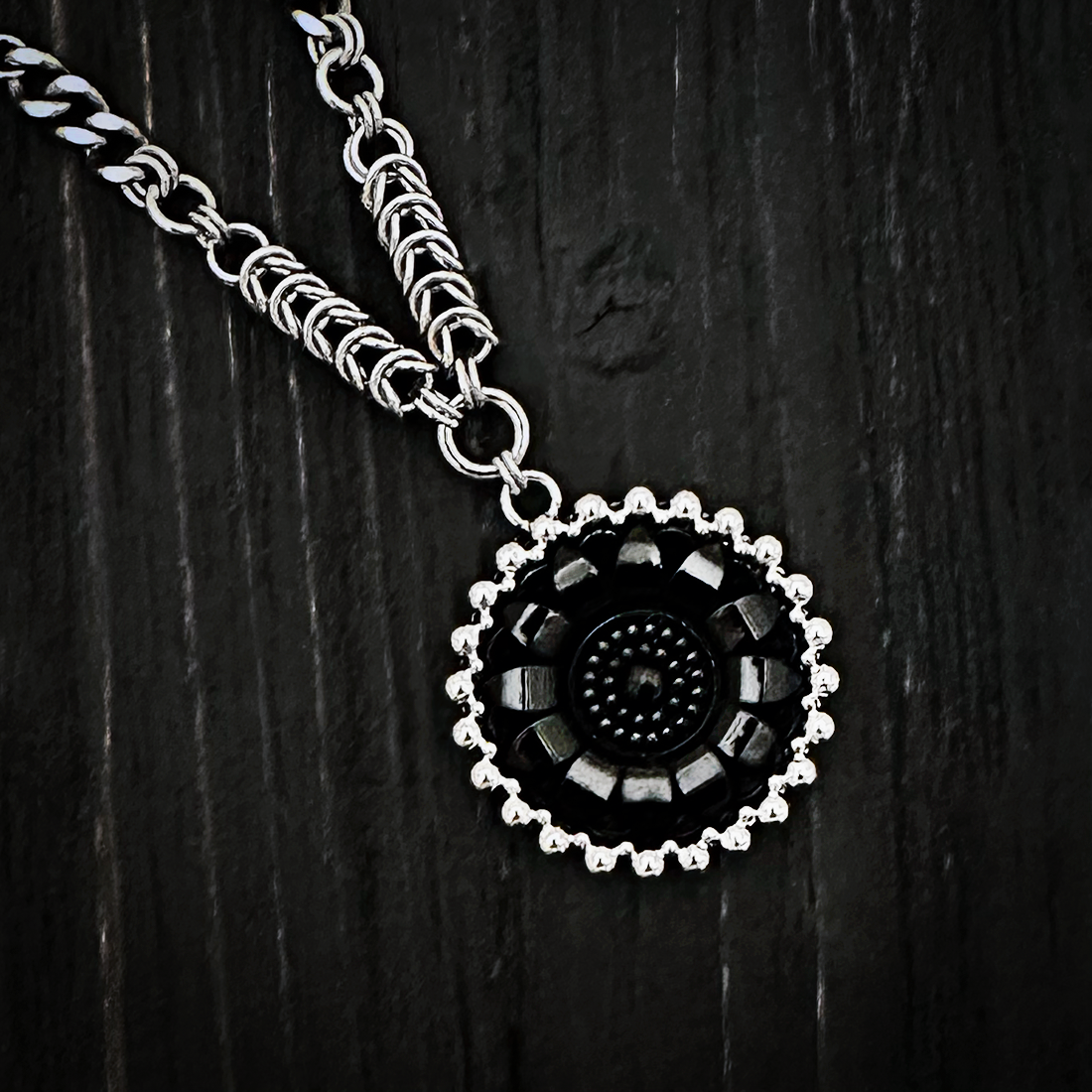 This vintage 1920's Czech glass flower button in shiny black is set with tiny stainless spheres and hangs from a necklace of mixed elements, including chainmaille rope, curb chain, and flattened cable chain.