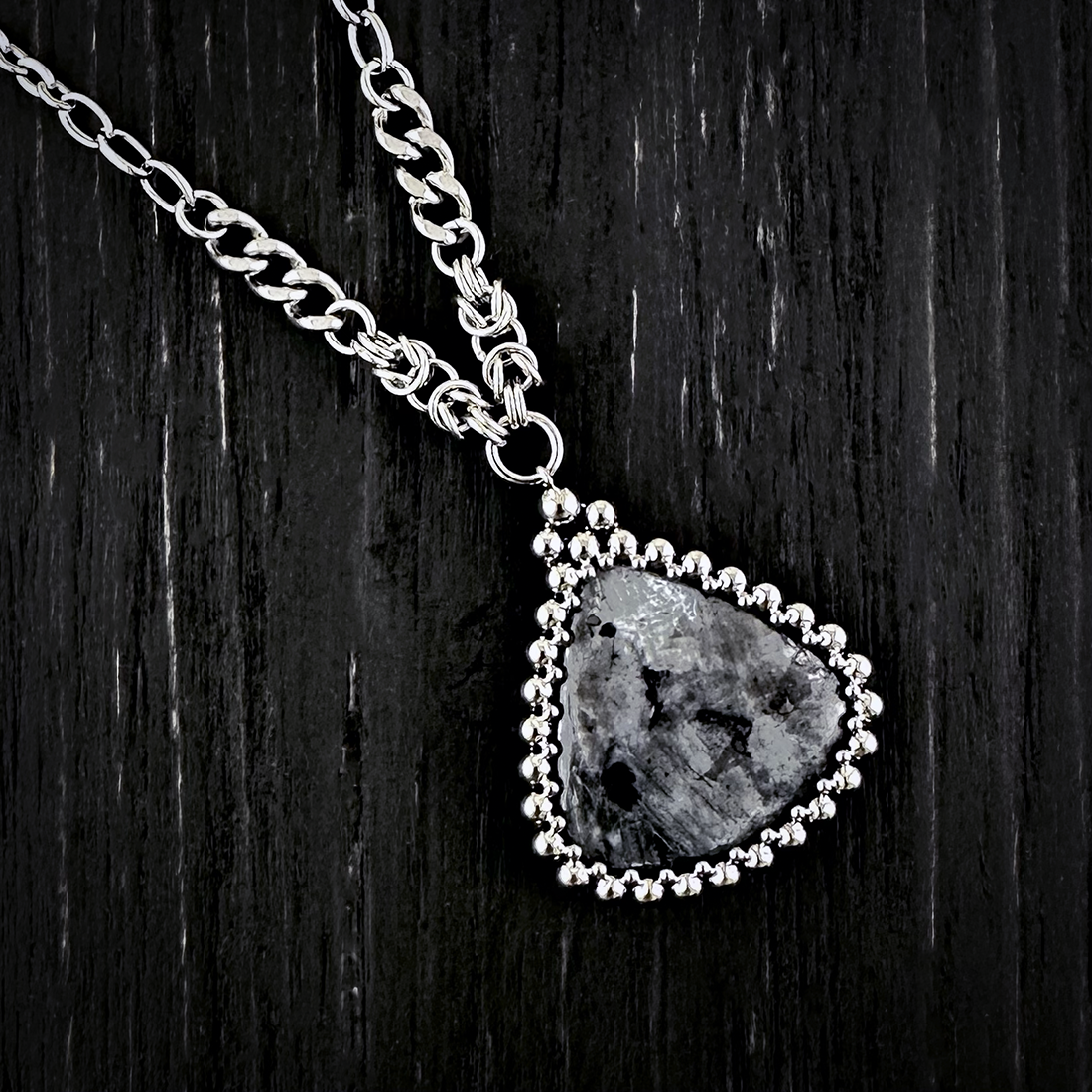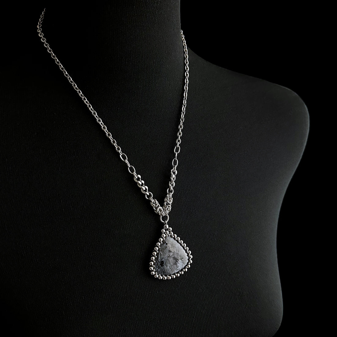 This flashy, silver-gray larvikite cabochon is set with tiny stainless spheres with an added triangular detail at the top. It hangs from a necklace of mixed elements, ending with a flattened cable chain.