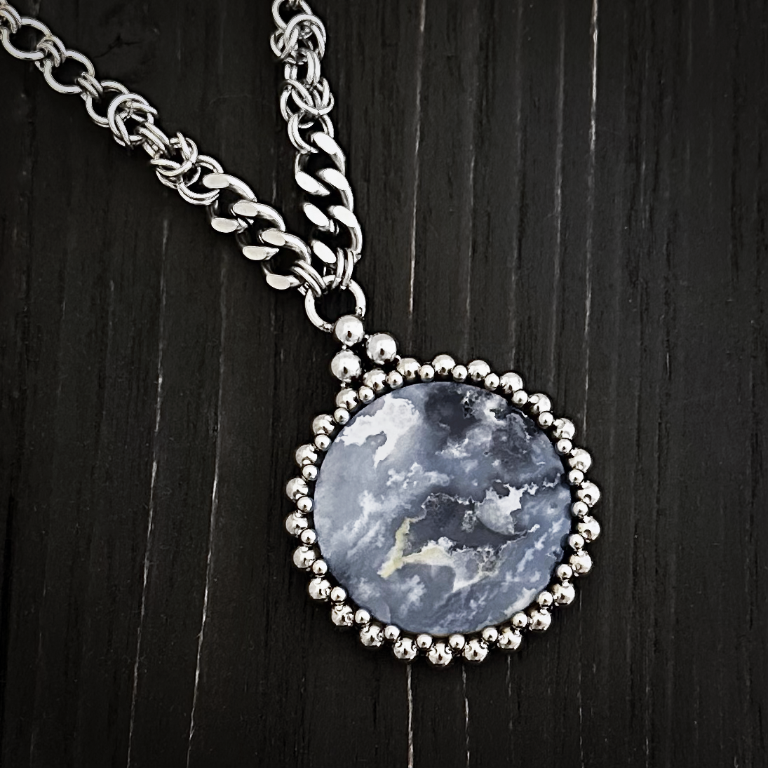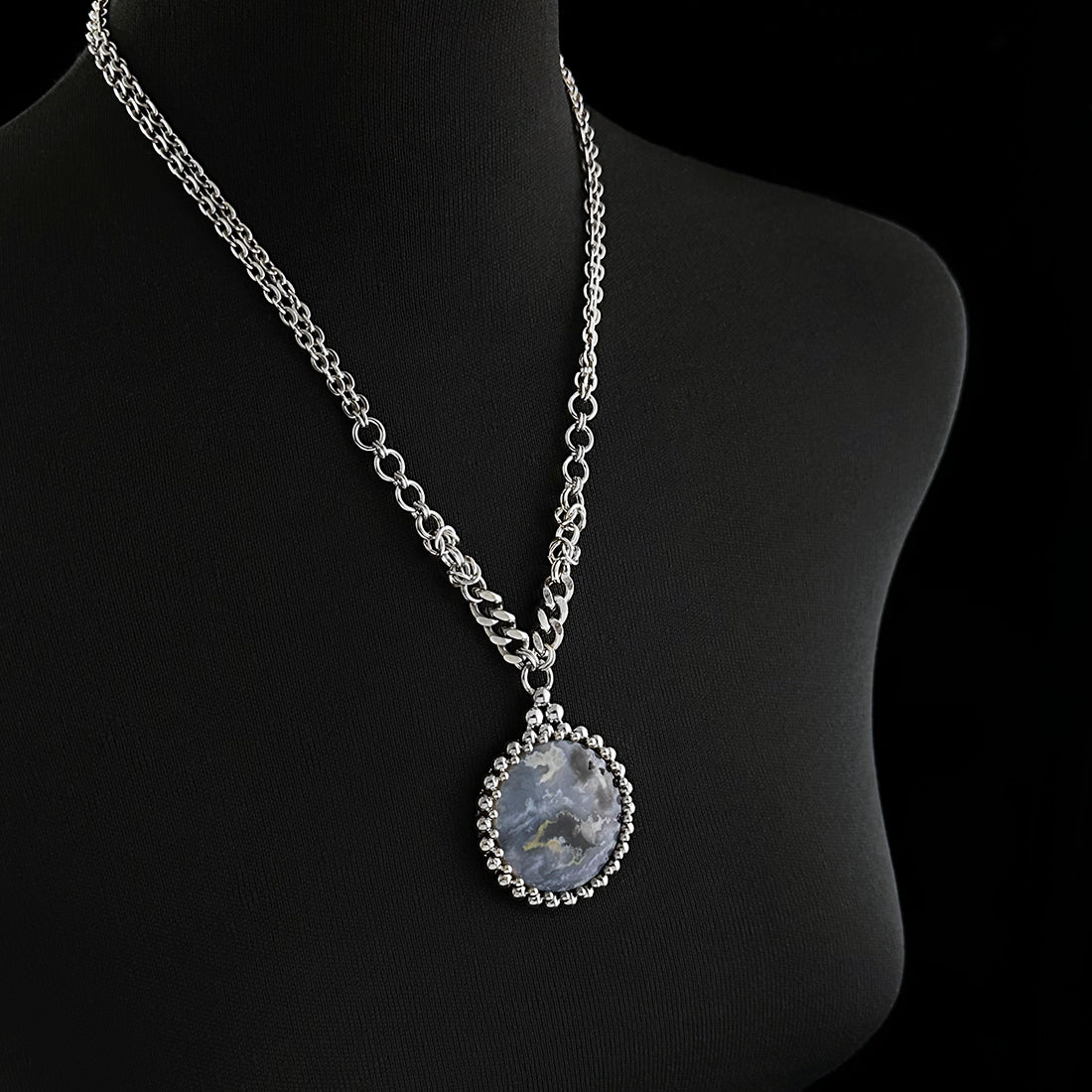This gorgeous blue plume agate resembles a wintry storm at sea with its blue-gray, white, black and beige swirling colors. It is set with tiny stainless spheres with an added triangular detail at the top. It hangs from a necklace of mixed elements, ending with a flattened cable chain.